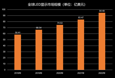 小間距LED品類增多,并開始與DLP和LCD競爭室內顯示市場。從全球LED顯示市場規模的數據上顯示,2018年到2022年,小間距LED顯示產品性能優勢明顯,形成對傳統LCD、DLP技術的替代趨勢。