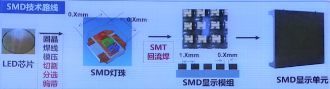SMD是表面貼裝器件的簡稱,將裸芯片固定在支架上,通過金屬線在正負極之間進行電氣連接,用環氧樹脂進行保護,制作成SMD LED燈珠,通過回流焊將LED燈珠與PCB進行焊接,形成顯示單元模組后,再將模組安裝在固定箱體上,配以電源、控制卡及線材等形成led顯示屏成品。
