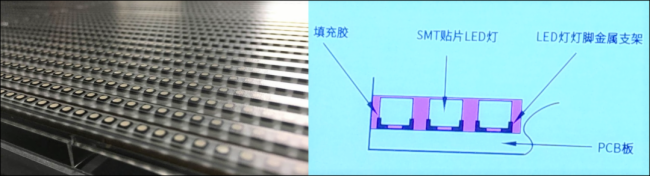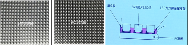 AOB是表貼模組底部覆膠技術,也是在傳統SMD小間距模組燈珠間隙里封裝半層透明膠體,解決防護性問題,其本質上還是SMD小間距產品,存在局限與潛在風險,例如難以做到P1.25以下間距,只能用TOP燈珠,表貼工藝的潛在問題仍然存在等。