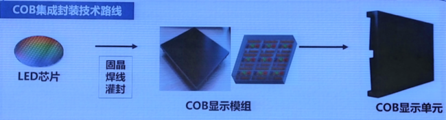 COB工藝是直接將LED芯片用導電或非導電膠粘附在PCB基本上,進行引線鍵合實現電氣連接(正裝工藝)或采用芯片倒裝技術(無需金屬線)使燈珠正負極直接與PCB連接(倒裝工藝),最后形成顯示單元模組,再將模組安裝在固定箱體上,配以電源、控制卡及線材等形成led顯示屏成品。COB技術其優點在于簡化了生產流程,降低了產品成本,功耗降低因此顯示表面溫度降低,對比度大幅提升,其缺點在于可靠性面臨更大挑戰,修燈困難,亮度、顏色、墨色還難做到一致性。
