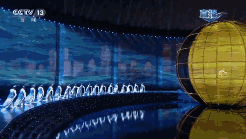 整個舞臺,真真再現了“海上升明月,天涯共此時”所描繪的美景畫卷,球屏上的月亮圓缺轉換,環幕中的海水潮漲潮落。演員們舞弄著水袖與燈光互動,唯美的海岸線城市景觀與當空明月相互輝映。讓人感受海之美,月之靈。