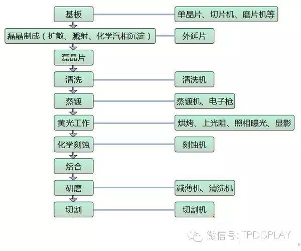 外延片→清洗→鍍透明電極層→透明電極圖形光刻→腐蝕→去膠→平臺圖形光刻→干法刻蝕→去膠→退火→SiO2沉積→窗口圖形光刻→SiO2腐蝕→去膠→N極圖形光刻→預清洗→鍍膜→剝離→退火→P極圖形光刻→鍍膜→剝離→研磨→切割→芯片→成品測試。