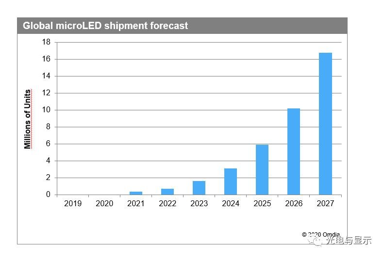 根據Omdia發布的《MicroLED顯示技術與市場 ─ 2020》報告,MicroLED顯示器的出貨量增長由智能手表和電視市場的需求引領。Omdia預計2027年智能手表市場的MicroLED顯示器出貨量將超過1000萬片,而同年電視市場的出貨量預計將增長到330萬片以上。