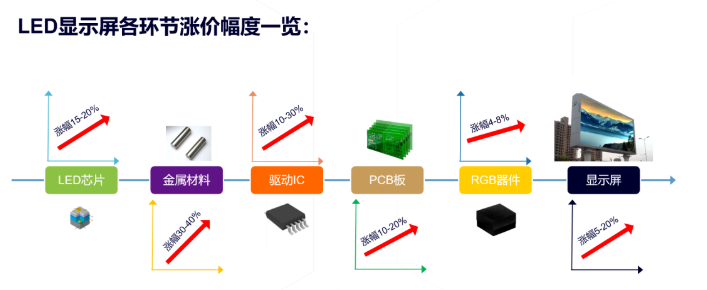 從LED顯示產品產業的漲價幅度來看,芯片漲幅為15-20%,金屬材料漲幅為30-40%,PCB板漲幅為10-20%,RGB器件漲幅為4-8%,驅動IC漲幅為10-30%。且因市場動態發展,相關漲價幅度也隨之變化。