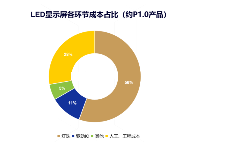 據迷你光電產業研究中心數據,一塊全彩LED顯示大屏由顯示屏箱體、顯示屏模組、電源等多個部分組成。以顯示微間距約P1.0產品成本為例:LED燈珠在其中所占比例大約為50%;驅動IC所占比例約為10%;PCB所占比例大約為10%;其他部分為5%;人工/工程成本為25%。而對于P1.0以上的顯示屏產品,LED燈珠占比逐步下降,驅動IC的占比則會增加。