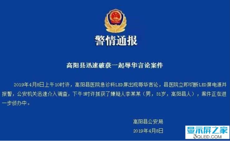 高陽縣公安局4月8日通過微信公號“保定晚報”通告稱,8日上午10時許,高陽縣醫院急診科led屏出現辱華言論,縣醫院立即切斷led屏電源并報警,公安機關迅速介入調查,下午3時許抓獲了嫌疑人李某某(男,31歲,高陽縣人),案件正在進一步偵辦中。F5hLED顯示屏廠家|江蘇迷你光電有限公司
