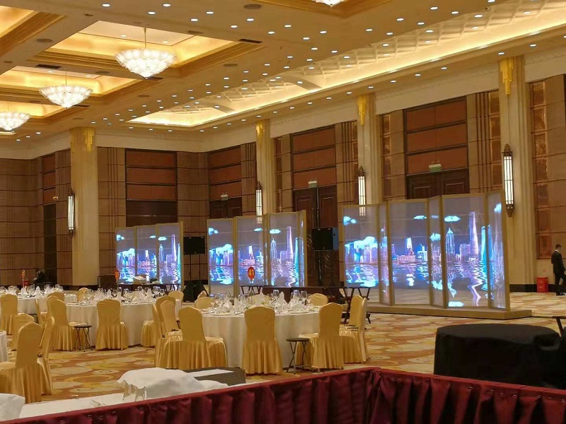 上海led有限公司為此次國際進出口博覽會專業定制了此款LED透明折疊屏風,用以滿足國際高規格的接待要求,彰顯我國在透明屏領域的創新實力。該LED透明折疊屏風畫面精美靚麗,富有科技感,屏體簡潔典雅大方,成為了宴會廳一道亮麗的風景線,營造了整體的歡愉氣氛和獨特的視覺效果。