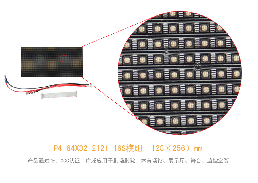 P4室內全彩led顯示屏采用封裝方式為SMD表貼2121燈珠(黑燈全彩)三合一,主要由紅綠藍三種顏色構成;一平方米有62500個像素點數,每個像素點之間的點間距為4mm;掃描方式為16掃,一平方米的消耗功率大概在500瓦每平方米,新穎面罩設置,顏色混合更均勻,高密度像素使畫質更清晰視角更寬;