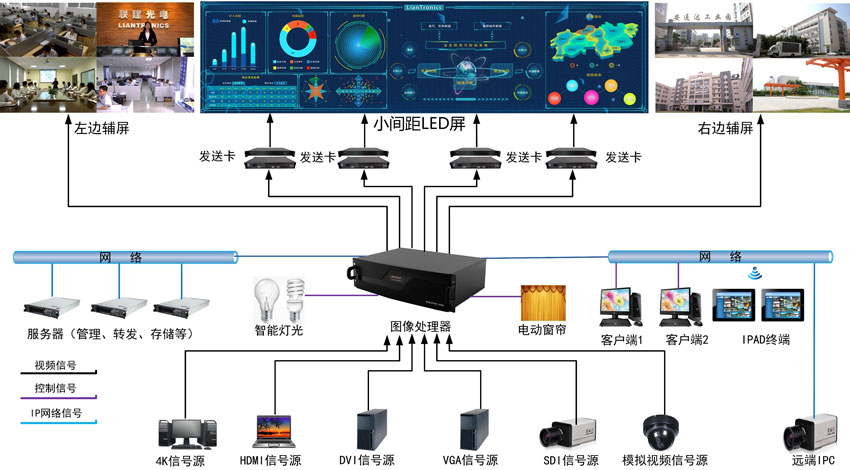 小間距系列顯示屏作為完整的視頻墻,用來顯示高分辨率的圖像畫面,真實還原現場;同時支持多路信號接入,處理后的畫面以窗口的形式在顯示墻上任意位置放大、縮小、漫游等,為各類決策提供直觀、快速的現代化手段。